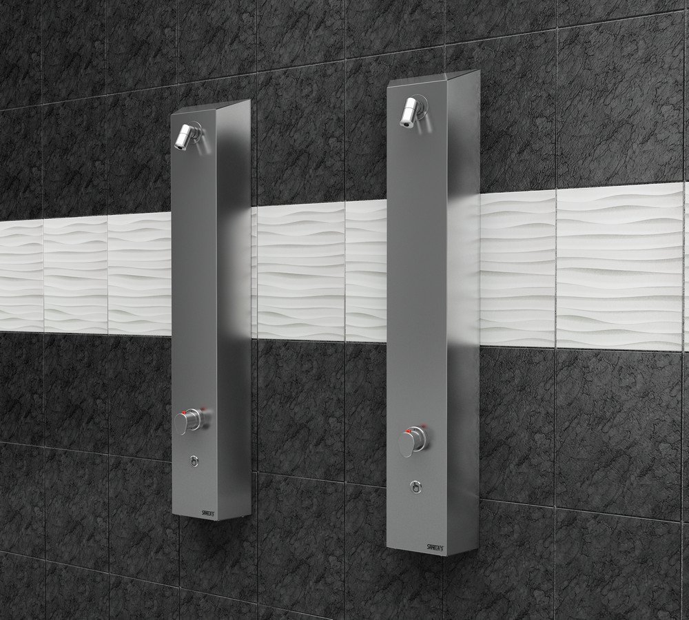 - stainless steel wall hung shower panels with integrated piezo electronics