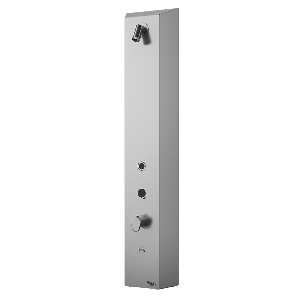 Stainless steel RFID token shower panel, with thermostatic mixer for cold and hot water, 24 V DC